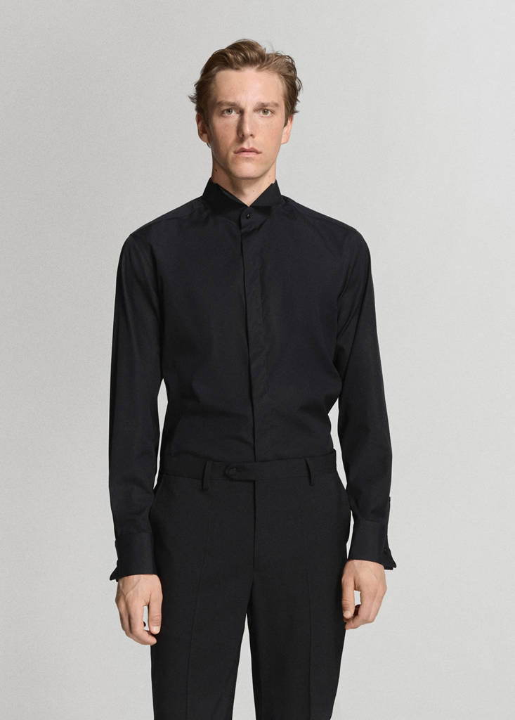 Dress shirt with a tuxedo collarCurrent price [EGP 6,299.00 ]EGP 6,299.00Select a colourBlackThe model is wearing size M and is 185cm tall.Select your sizeXSLast few items!SMLXLMeasurementsAddAdd to your wishlistSee lookFree delivery to storeSlim fit. 100% cotton fabric. Neck lapel Tuxedo. Long sleeves with buttoned strip cuffs. Front closure with buttonsDetails, composition and careStore availability