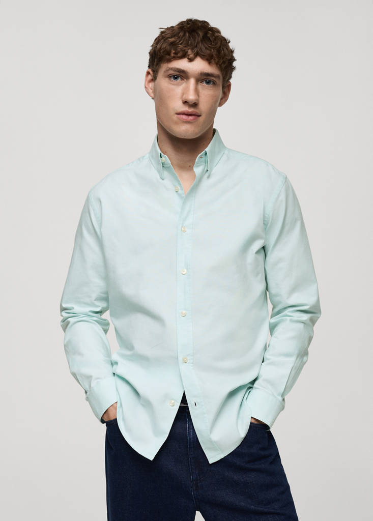 Lightweight fabric. Regular fit. Button up. 100% cotton fabric. Oxford fabric. Shirt collar. Buttoned cuffs. Rounded base. Front closure. Standard design. Long sleeves