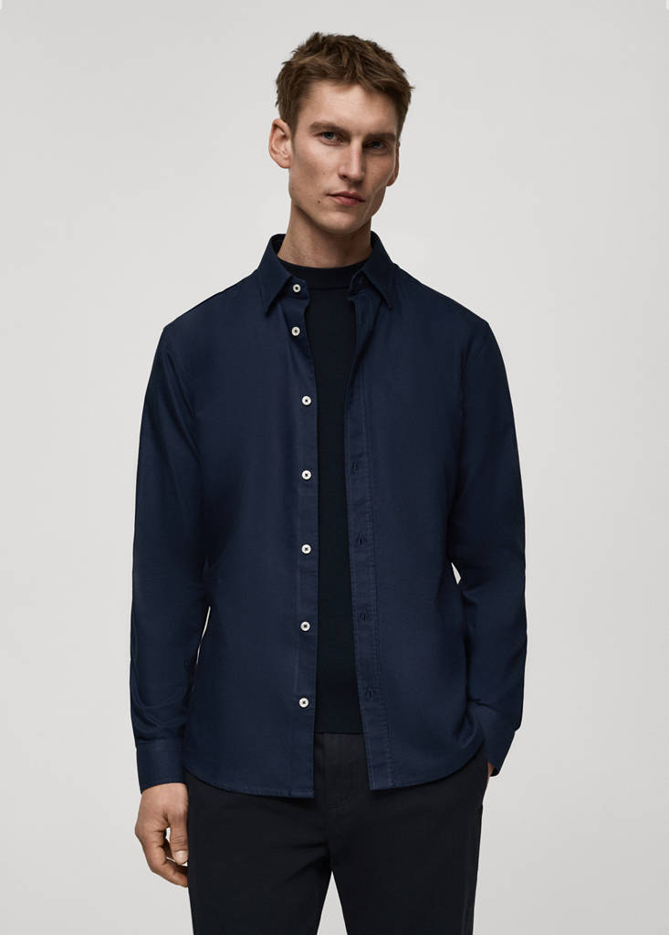 Lightweight fabric. Regular fit. Button up. 100% cotton fabric. Oxford fabric. Shirt collar. Buttoned cuffs. Rounded base. Front closure. Standard design. Long sleeves