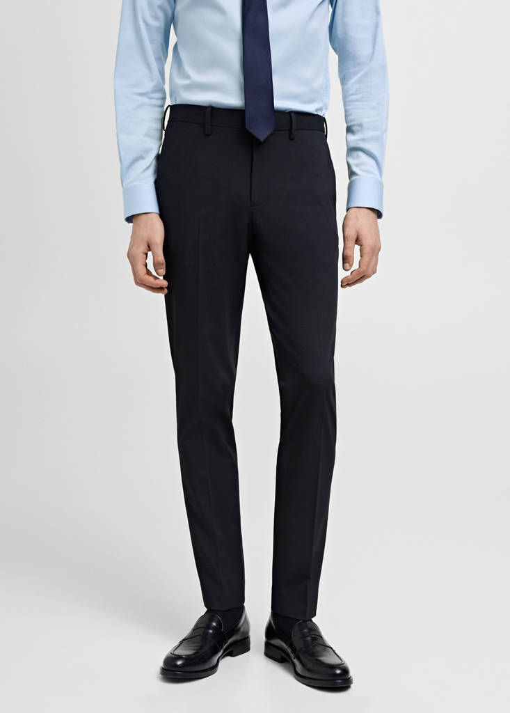 Slim fit. Tailoring collection. Belt loops. Front fastening with double-breasted buttons and zip. Side pockets. Two welt pockets with button at the back. Pressed crease detail at the front and back. Super slim fit. Standard Length. Comfort Stretch: Stretch fabric for added comfort. Stretch fabric providing maximum comfort and freedom of movement. Flat structure Lightweight. Fabric made of recycled polyester, a durable, breathable, easy-care fibre that provides comfort in use. Mid-rise. Regular Waist. Silhouette Super Slim Fit. Concealed button, hook and zip fastening. Coin pocket. Belt loops. Two front pockets. Two buttoned patch pockets on the back. Two side pockets. Concealed coin pocket at hip level. Two welt pockets with button at the back. Comfort: Horizontal and vertical stretch fabric for added comfort. Smart collection. Sustainable cotton. Serge fabric. Stretch fabric. Chinos style. Easy iron. Belt loops. Belt loop. Zip and button fastening