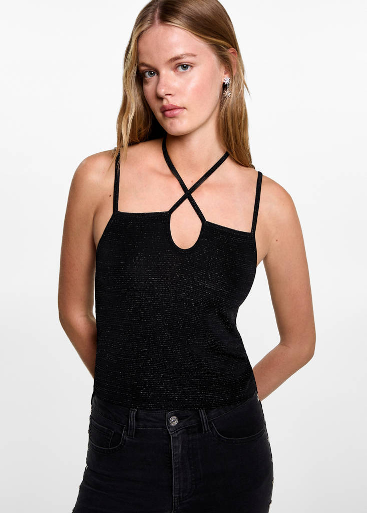 Party and events collection. Lurex detail. Straight design. Crossover straps. Thin straps. Adjustable straps. Crossed bow closure. The model's image has been created using artificial intelligence
