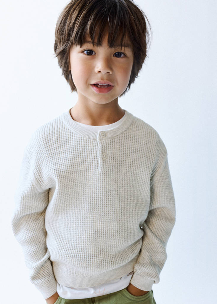 Teixit 100% cotó. Teixit de punt. Disseny recte. Coll rodó. Màniga llarga. Tancament de botons al coll. Coll, punys i baix de canalé. Col·lecció Sant Valentí