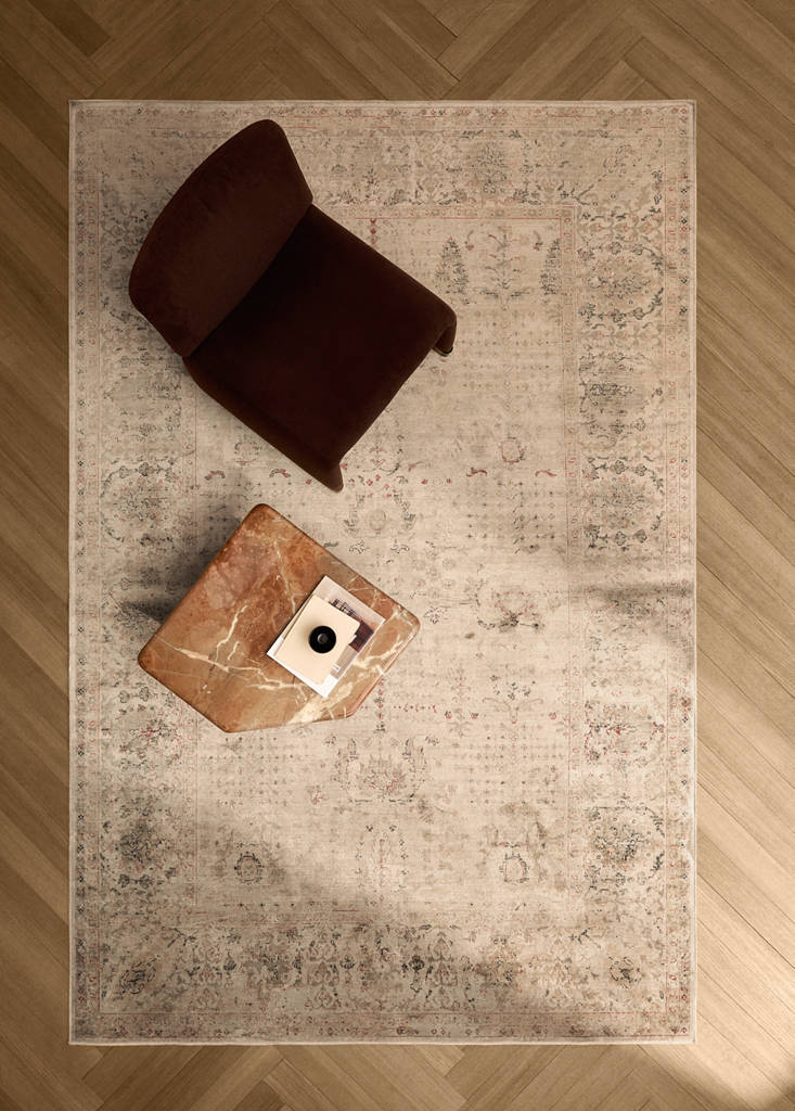 Cotó i viscosa. Mida: 200x300 cm. El seu patró central intricat combina formes florals i arabescos amb un efecte desgastat o envellit, donant-li un caràcter vintage i sofisticat. El disseny difuminat crea un efecte visual suau i harmoniós, ideal per a estances d'estil clàssic o bohemi