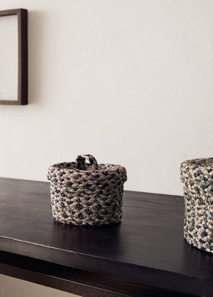 Teixit 100% jute. Mida: 15x11 cm. Lleuger efecte melange. Tanca mitjançant tapa. Nansa curta. Perfecta per a emmagatzematge o element decoratiu. Disponible en diferents mides