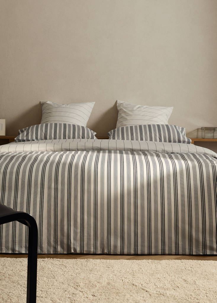 Llit 180/200cm. Mida: 260x240cm. 100% cotó. 200 fils de cotó que ofereixen la màxima suavitat, resistència i transpirabilitat, proporcionant una sensació de lleugeresa suau al tacte. Estampat de ratlles. Teixit reversible. Textura agradable. Combina amb més productes de la col·lecció. Aquest producte no inclou les fundes de coixí