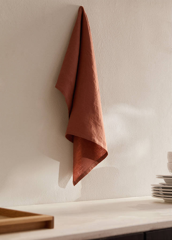 100% lli. Mida: 50x70 cm. Drap de cuina amb disseny minimalista i funcional. Confeccionat amb 100% lli, un material que destaca per la seva durabilitat, absorbència i textura lleugera, cosa que el fa ideal per a l'ús diari a la cuina. El disseny inclou una petita cinta en un dels extrems i facilita penjar-lo en ganxos o barres, cosa que n'optimitza l'emmagatzematge i accessibilitat