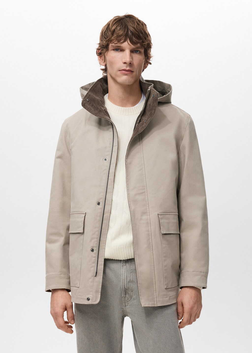 Silueta recta. Disseny encoixinat. Coll de xemeneia. Vores de canalé al coll. Caputxa desmuntable. Jaqueta interior desmuntable. Dues butxaques de solapa laterals. Butxaca de pegat i botó a l'interior. Màniga llarga amb punys botonats. Tanca davantera amb cremallera i botons ocults.