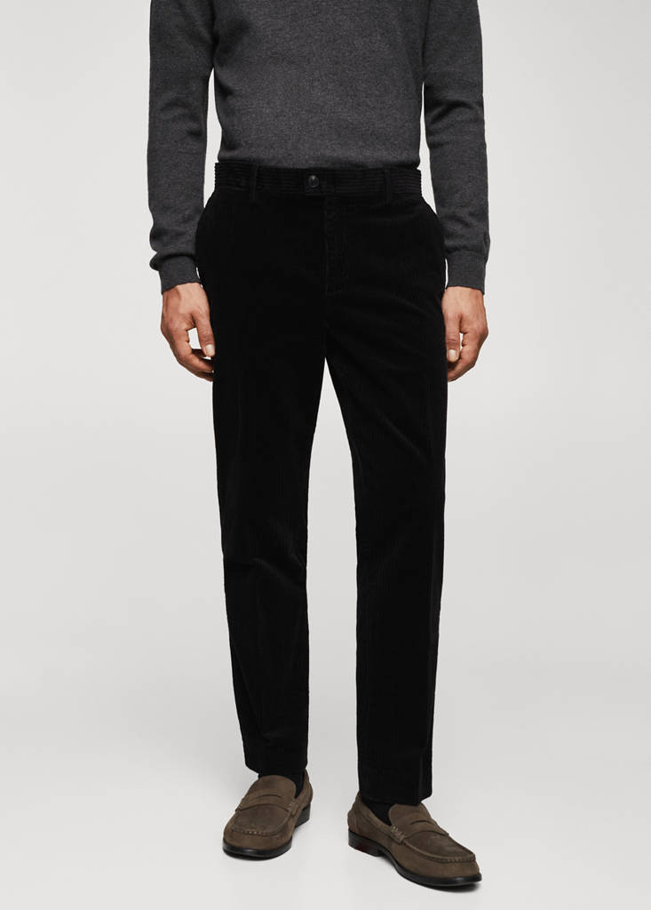 Slim fit. Teixit de cotó. Teixit de pana. Tancament de cremallera i botó. Travetes per a cinturó. Dues butxaques davanteres. Dues butxaques amb botó a la part posterior. Detall de ratlla planxada a la part del davant i del darrere