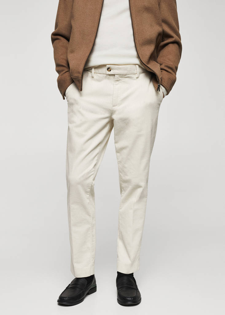 Slim fit. Teixit de cotó. Teixit de pana. Tancament de cremallera i botó. Travetes per a cinturó. Dues butxaques davanteres. Dues butxaques amb botó a la part posterior. Detall de ratlla planxada a la part del davant i del darrere