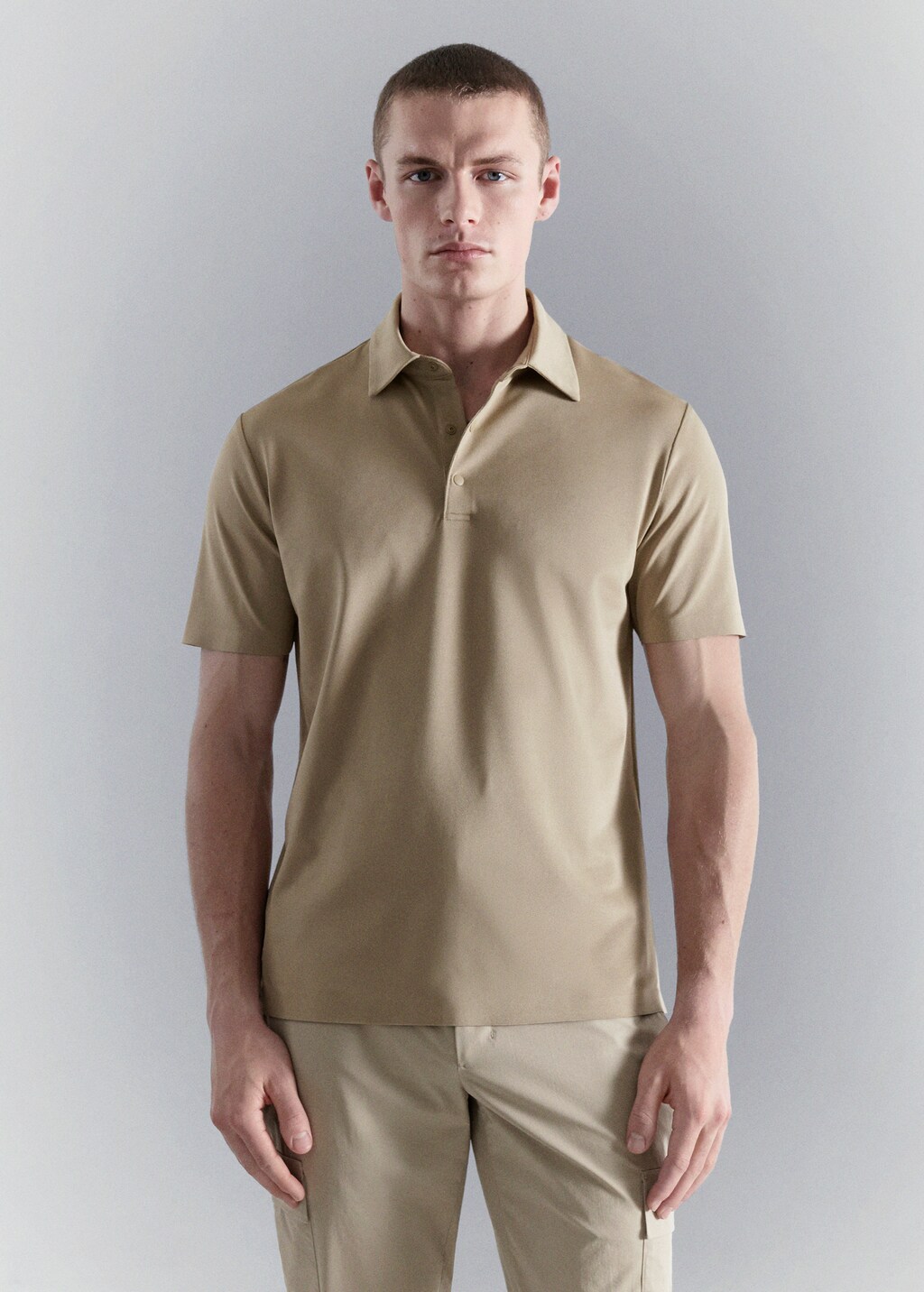 Termoregulador: Aquest teixit ofereix una transpirabilitat òptima per mantenir-te a una temperatura estable. Slim fit. Coll polo amb tanca de botons a pressió. Màniga curta. Petites obertures laterals a la part baixa. Baix recte. Coolmax® és un teixit especial que ajuda a expulsar la humitat de la pell, amb la qual cosa, en climes freds permet mantenir el cos sec i calent, en climes càlids, destaca per la seva lleugeresa i frescor