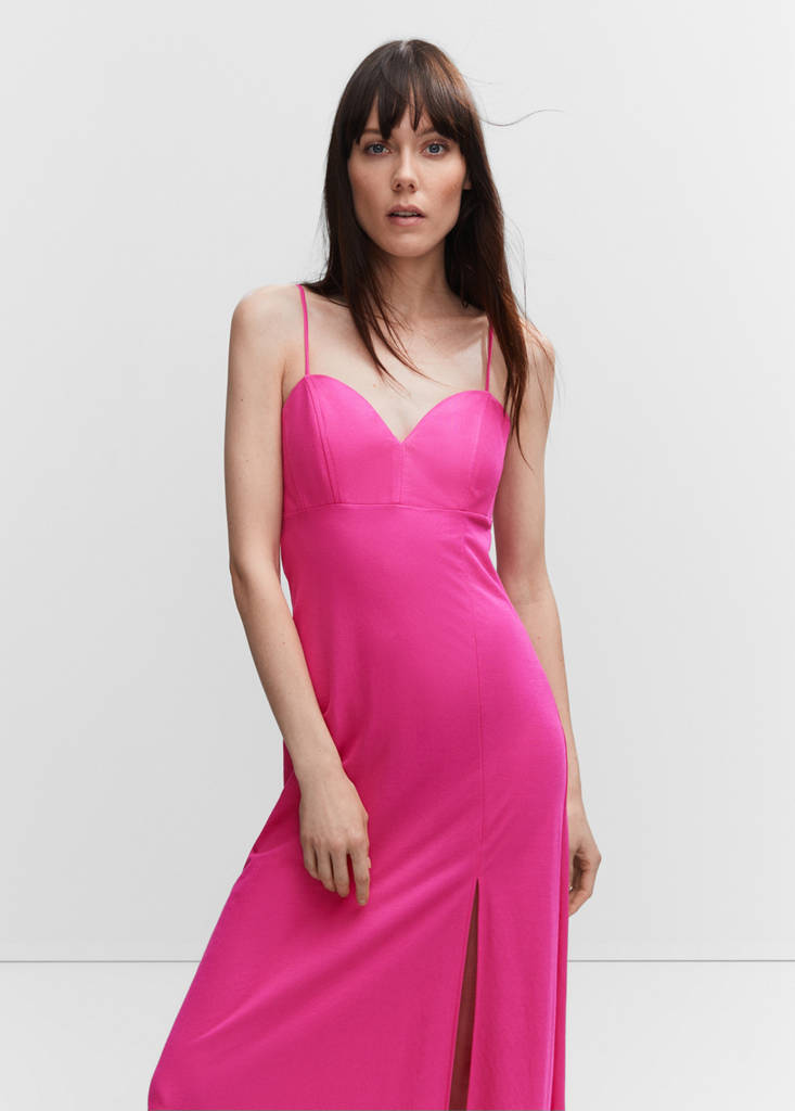 Tejido fluido. Tejido ligero. Sin forro interior. Cuello escotado. Cierre lateral. Diseño recto. Diseño midi. Escote corazón. Tirantes finos. Espalda abierta. Cierre de lazo en la espalda. Abertura lateral