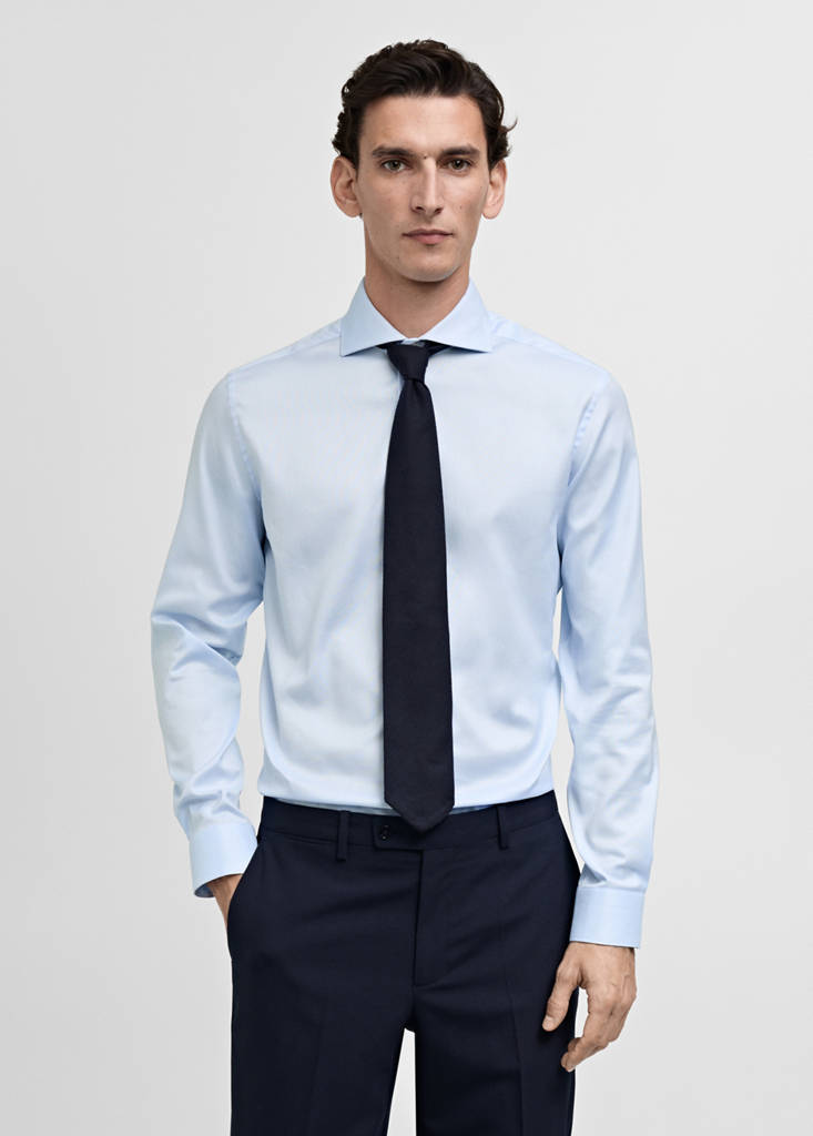 Slim fit. Tejido de popelín confeccionado en algodón 100%. Easy iron: tejido de fácil planchado. Cuello americano. Manga larga con puños abotonados. Cierre de botón en la parte delantera. Bajo redondeado