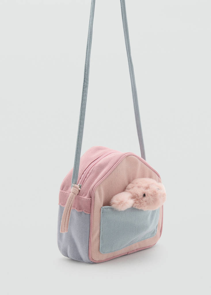 Tejido de pana. Diseño de casita. Asa larga. Cierre de cremallera. Peluche infantil con forma de perro
