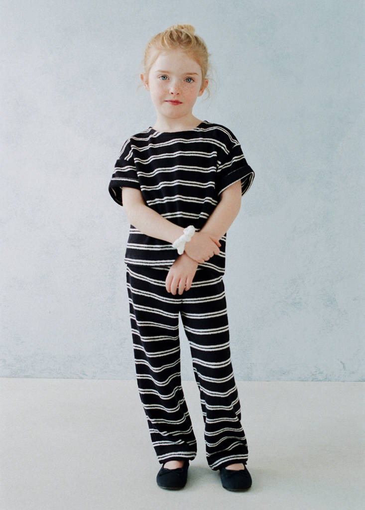 Confeccionada en tejido de algodón de punto fino con rayas, esta prenda presenta un diseño recto y manga corta. Incluye un cierre de lágrima en la parte posterior, ideal para un total look