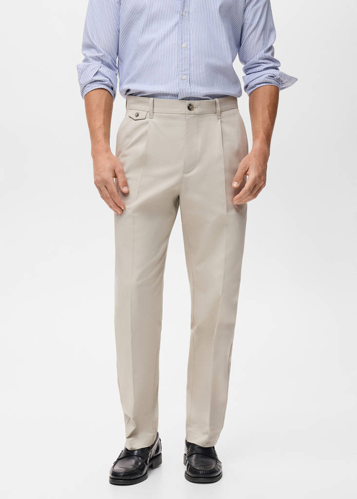 Regular fit. Tejido 100% algodón. Detalle de pinzas delanteras. Dos bolsillos laterales. Bolsillo parche delantero. Trabillas para cinturón