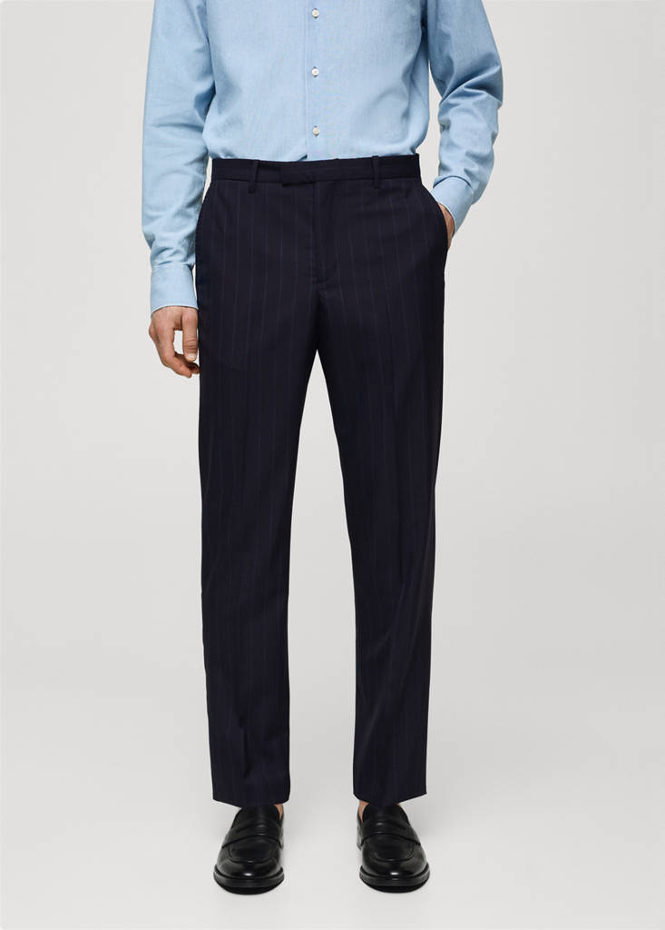 Tejido 100% lana italiana de la casa Vitale Barberis Canonico®, referente en el mundo de la sastrería. Diseñado en Italia. Fabricado en Portugal. Slim fit. Estampado de raya diplomática. Trabillas para cinturón. Cierre delantero de cremallera, doble gancho y botón interior. Botones en el interior de la cintura para tirantes. Dos bolsillos delanteros. Dos bolsillos de ribete con botón en la parte posterior. Bajo recto. Detalle de raya planchada en la parte delantera y trasera