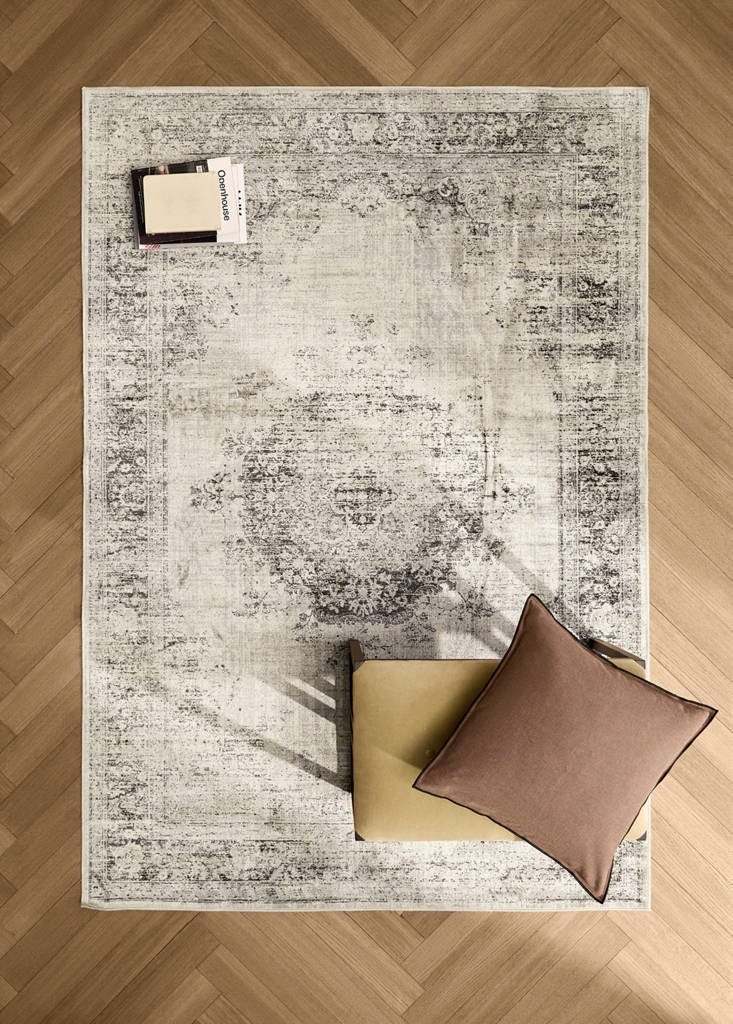 Algodón y viscosa. Tamaño: 200x300 cm. Hecho en España. Su patrón central intrincado combina formas florales y arabescos con un efecto desgastado o envejecido, otorgándole un carácter vintage y sofisticado. El diseño difuminado crea un efecto visual suave y armonioso, ideal para estancias de estilo clásico o bohemio. Disponible en más tamaños