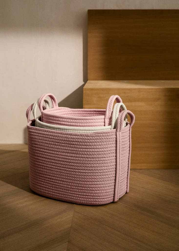 Tejido 100% algodón. Tamaño: 35x25x25cm. Dos asas. El perfil de los cestos es bajo y ancho, lo que les confiere una apariencia estable, ideal para almacenar y organizar objetos de manera práctica. Cada cesto está equipado con dos asas robustas en ambos extremos mayores, permitiendo un agarre cómodo y seguro, facilitando su traslado de un lugar a otro con facilidad. El diseño de los cestos no solo es práctico sino también decorativo, lo que les permite integrarse armoniosamente en diferentes ambientes y estilos decorativos. Combina elegancia y originalidad en cualquier espacio. Combina con más productos de la colección