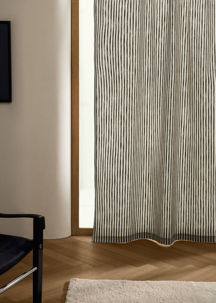 Tejido algodón y lino. Tamaño: 140x270cm. Diseño de rayas. Opacidad alta. Travesera superior con una sola trabilla para barra. Se vende por unidad