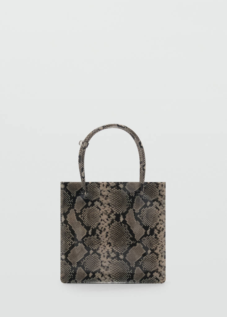 Tamaño mini. Diseño cuadrado. Doble asa. Estampado animal print. Sin cierre. Cierre de botón a presión en las asas