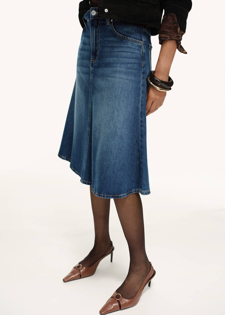 Confeccionada en tejido de algodón estilo tejano vaquero, esta falda presenta un diseño midi y evasé. Incluye tiro medio, trabillas y cinco bolsillos, con cierre de botón y cremallera