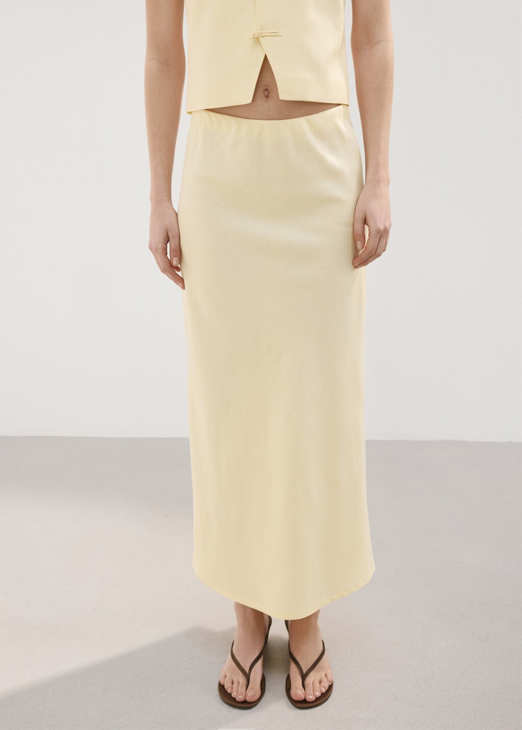 Tejido mezcla de algodón y lino. Diseño recto. Diseño midi. Tiro medio. Total look. El color amarillo es exclusivo online