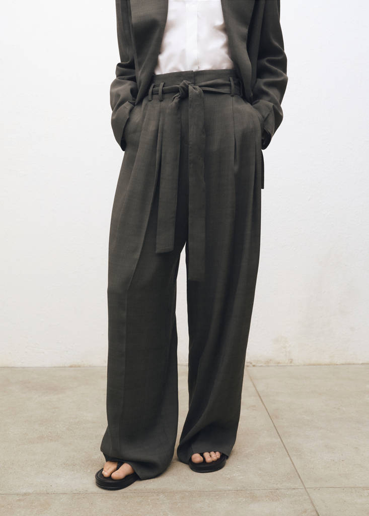 Tejido de viscosa. Tejido fluido. Diseño wideleg. Tiro alto. Trabillas. Dos bolsillos laterales. Cinturón tipo batín. Cinturón ajustable. Detalle de pinzas. Forro interior. Total look. Colección Selection