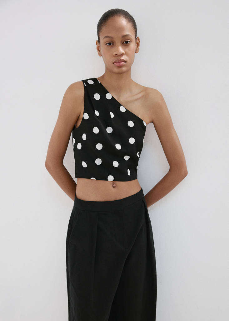 Tejido mezcla de lino y lyocell. Diseño asimétrico. Diseño crop. Estampado de lunares. Cierre de cremallera lateral. Total look