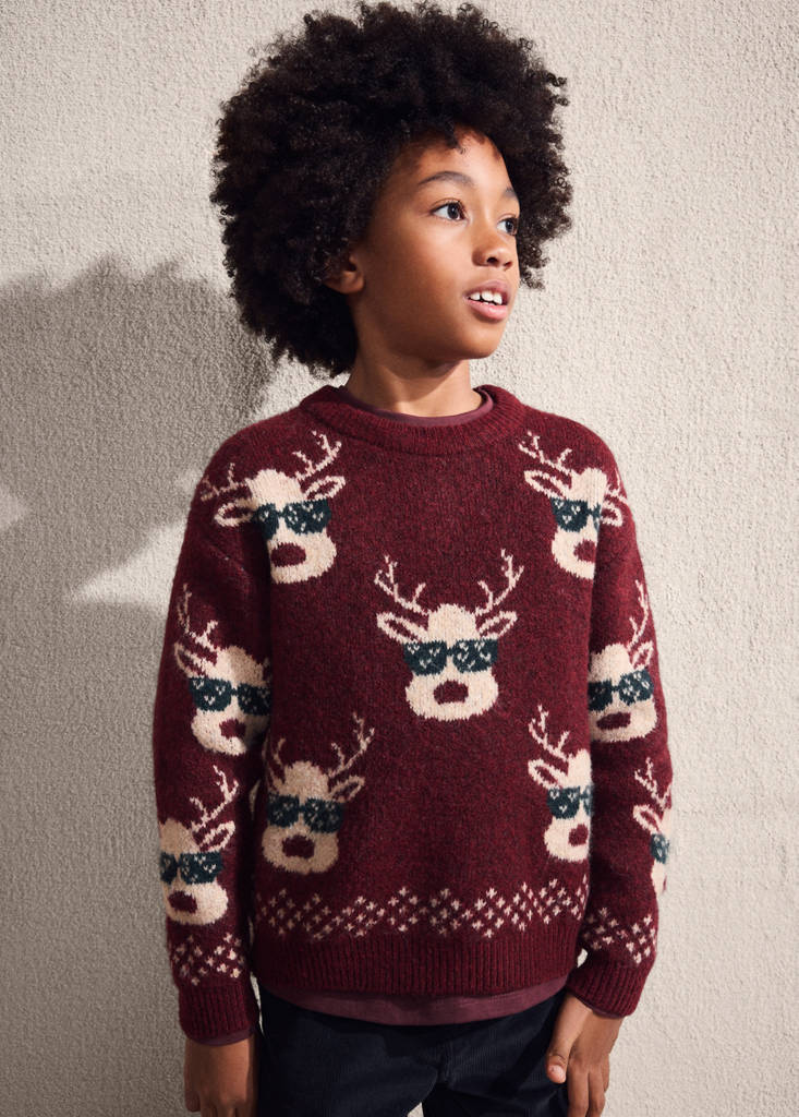Tejido de punto. Diseño reno. Bordado navideño. Cuello redondo. Manga larga. Cuello, puños y bajo en canalé. Colección Navidad