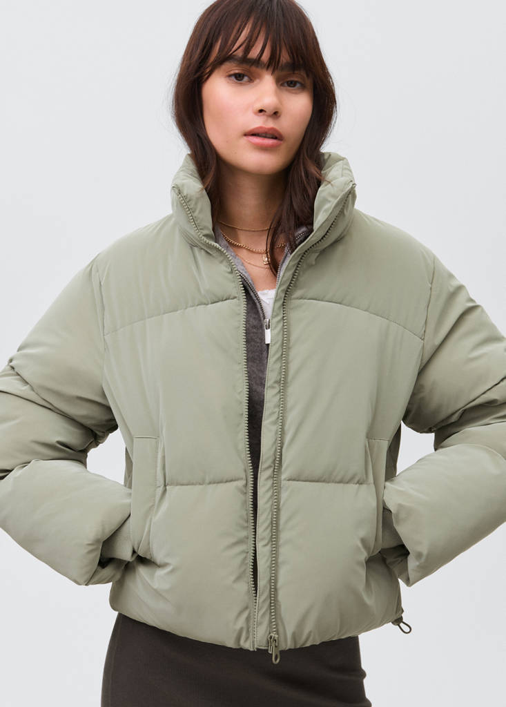 Tejido acolchado. Tejido poliéster. Diseño recto. Cuello perkins. Manga larga. Cierre de cremallera. Dos bolsillos laterales