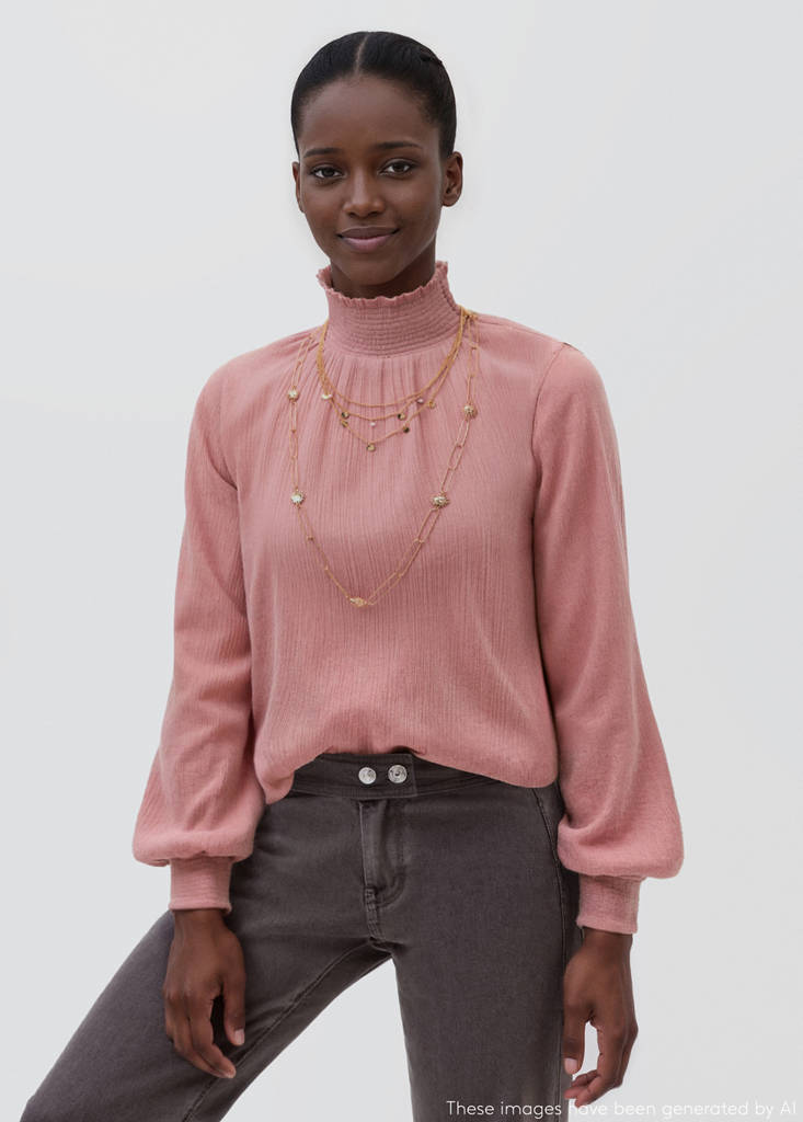 Confeccionada en tejido 100% algodón, esta blusa presenta un diseño recto y fluido. El cuello alto fruncido añade un toque distintivo, mientras que las mangas largas con puños elásticos y fruncidos completan el estilo
