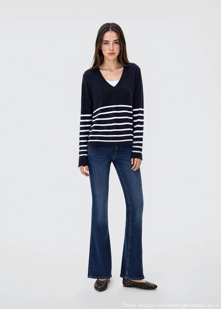 Tejido de algodón. Tejido de punto. Tejido de rayas. Diseño recto. Cuello pico. Manga larga