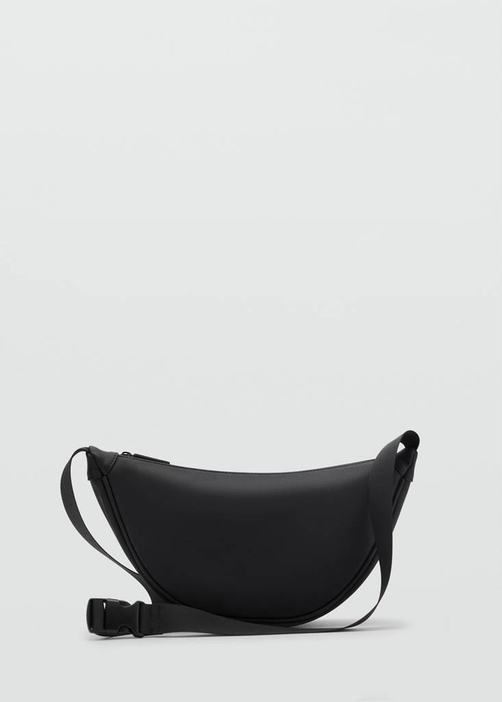 Gummed fabric. Long adjustable strap with buckle closure. Main compartment with zip closure