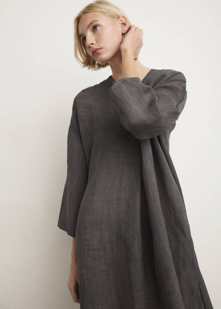 100% ramie. V-neck. Midi design. Long sleeves. Fluid fabric. Side slit. Combines comfort and style. Coordinates with more products from the collection