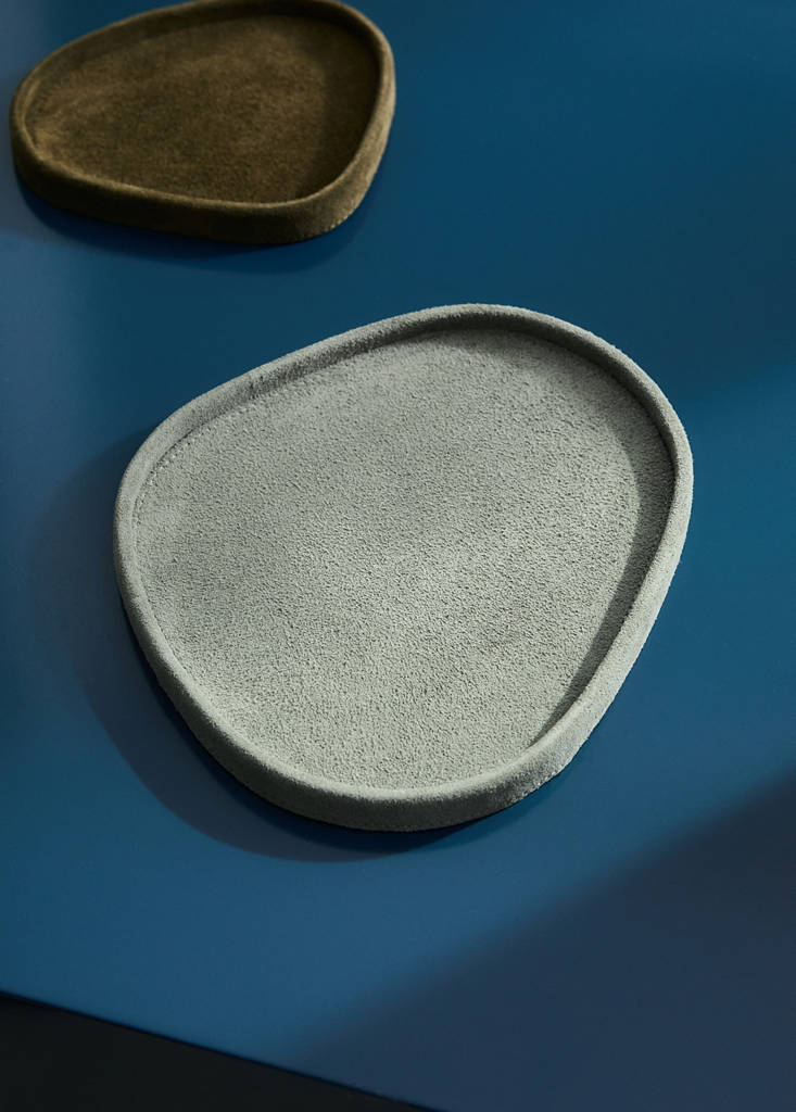 Crafted and lined in split leather. Size: 24x20x1.5 cm. Decorative tray with an irregular oval silhouette and elevated edges. Available in more sizes