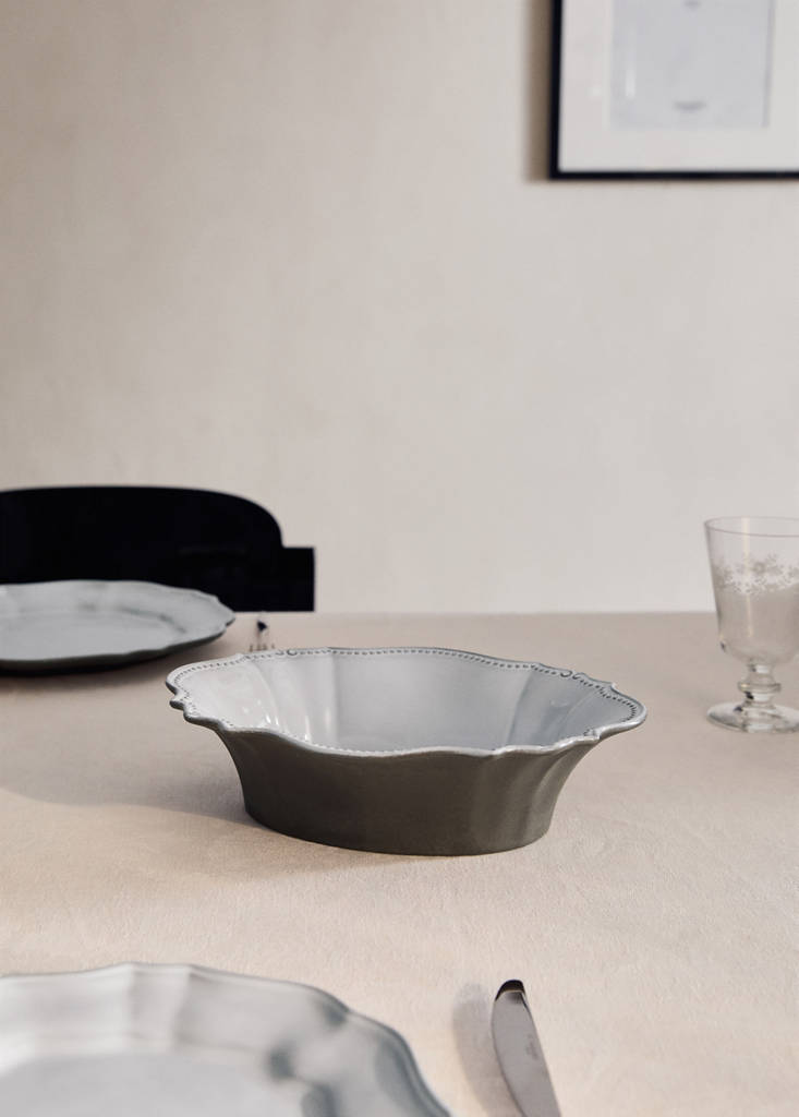 100% stoneware. Diameter: 27cm. High-quality and durable materials. The edges are decorative and scalloped, giving it an elegant and classic look. Perfect for adding a touch of luxury and sophistication to any table. Coordinates with more products from the collection. Tableware made from recycled stoneware in Portugal. At least 70% of the final product is recycled through the reuse of raw materials and responsible water usage, respecting the environment around us.