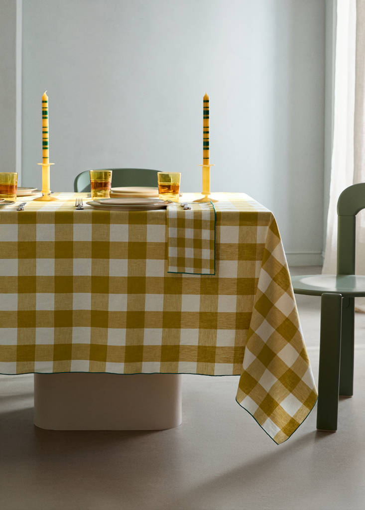 Size: 150x250 cm. Seats 6 to 8. Cotton and linen blend fabric. Gingham check design. Contrast edge overlock. Fresh, soft, durable, breathable, versatile. Available in various sizes. Available in different colours. Decorate your table with a special touch