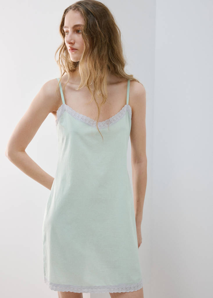 Short nightdress 100% cottonCurrent price [€ 39,99 ]€ 39,99Select a colourBlueThe model is wearing size S and is 178cm tall.Select your sizeSNot available. I want it!MLast few items!LLast few items!DimensionsAddAdd to your wishlistSee lookFree delivery to store100% cotton fabric. Plain design. Dress-style nightdress. Embroidery Neck Detail. Thin straps. Cushion cover with embroidered detailsDetails, composition and careStore availability