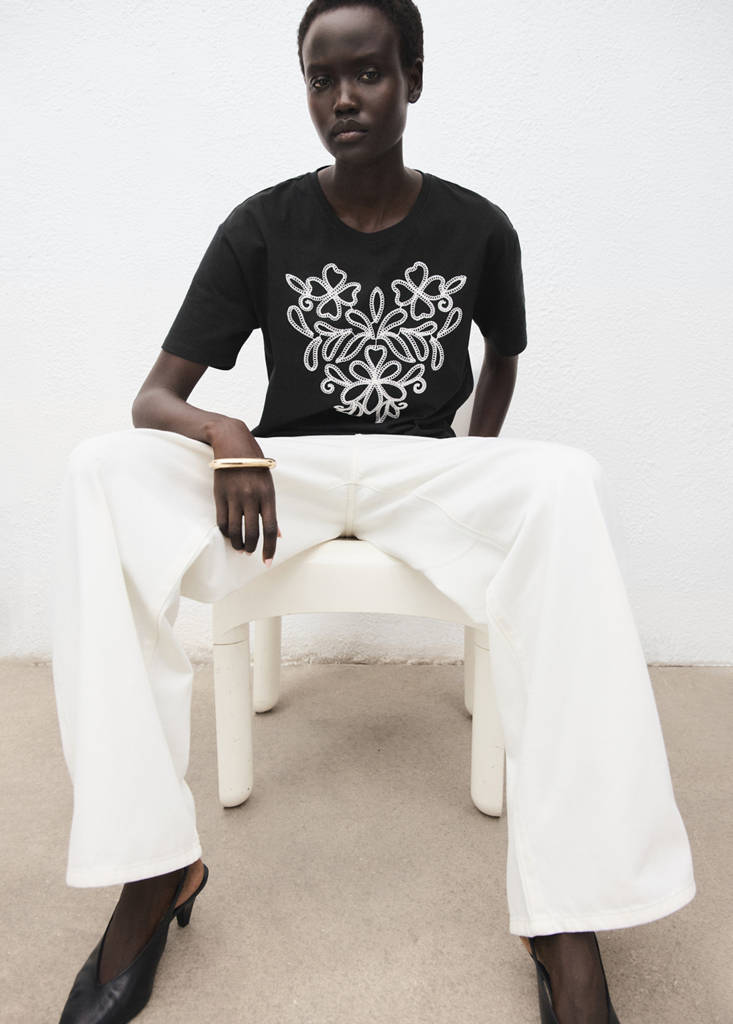 Floral-embroidered cotton t-shirtCurrent price [€ 22,99 ]€ 22,99Select a colourBlackThe model is wearing size S and is 178cm tall.Select your sizeXSNot available. I want it!SNot available. I want it!MNot available. I want it!LNot available. I want it!XLNot available. I want it!DimensionsNotify meAdd to WishlistSee lookFree delivery to store100% cotton fabric. Straight design. Flowered embroidery. Round neck. Short sleeves. No FasteningDetails, composition and careStore availability