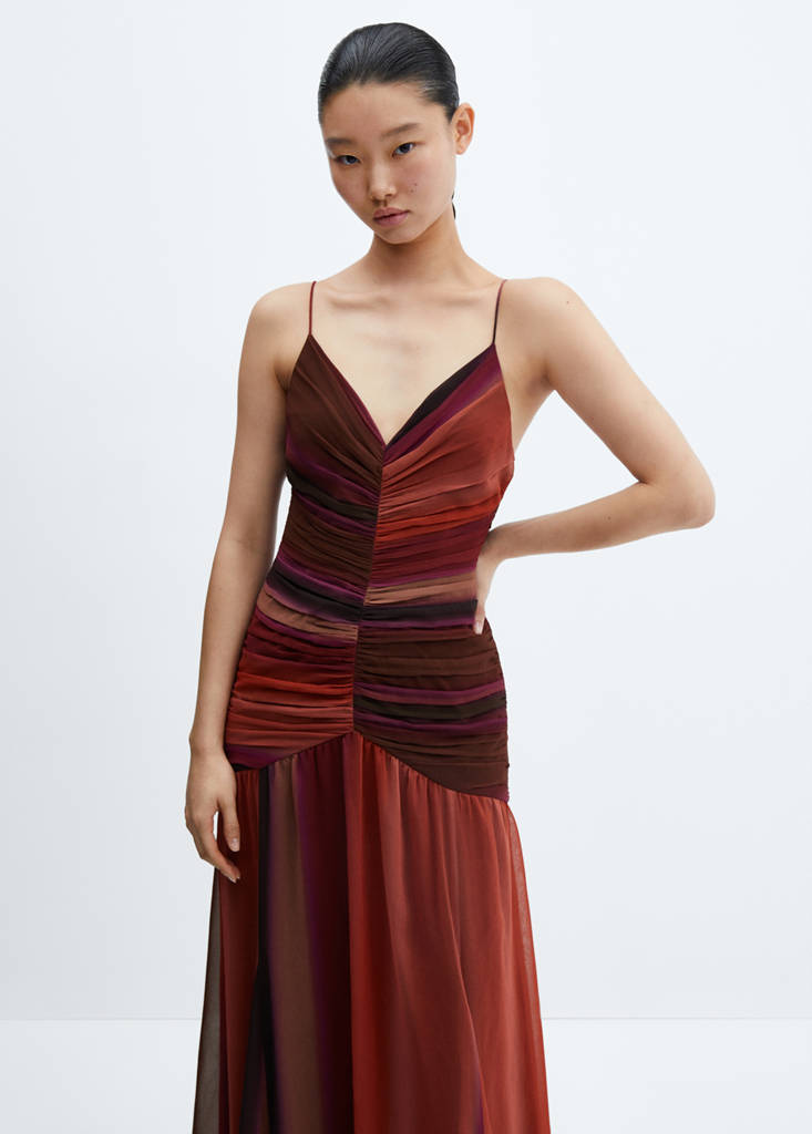 Tissu fluide. Design long. Design évasé. Sans manches. Bretelles fines. Dos nu. Nœud réglable dans le dos. Doublure