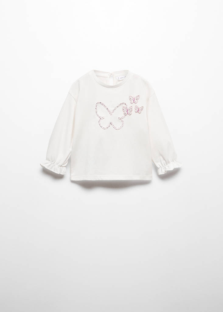 100% coton. Coupe droite. Col rond. Manche longue. Détail froncé aux poignets. Fermeture à boutons. Imprimé papillons