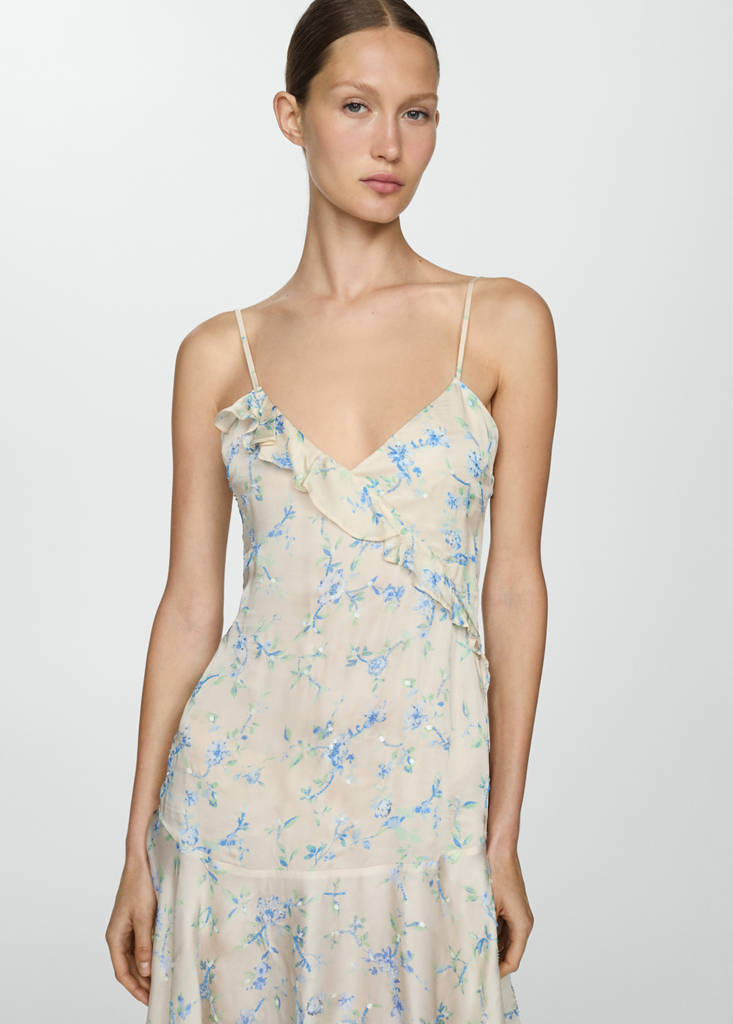 Tissu fluide. Design évasé. Coupe courte. Imprimé floral. Col en V. Bretelles fines. Dos avec décolleté. Détail de volants. Détail en sequins. Détail perlé. Fermeture Éclair latérale. Bas évasé. Collection fêtes, cérémonie et communion