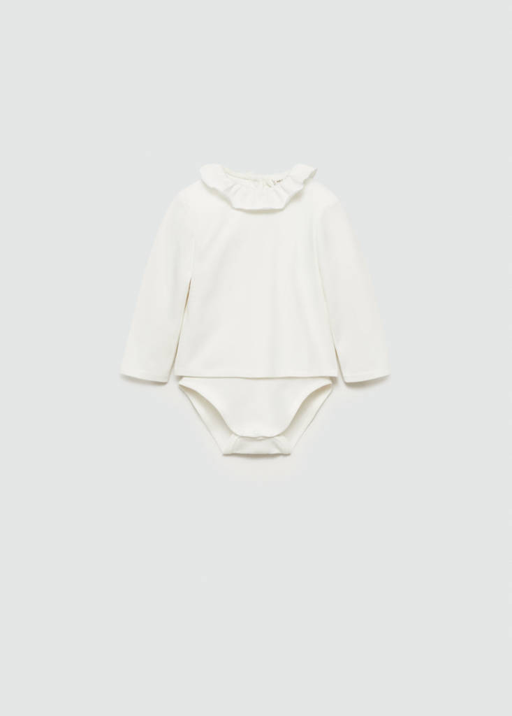 Tissu en coton mélangé. Coupe droite. Body col volant. Manche longue. Fermeture par boutons-pression. Ensemble disponible en total look
