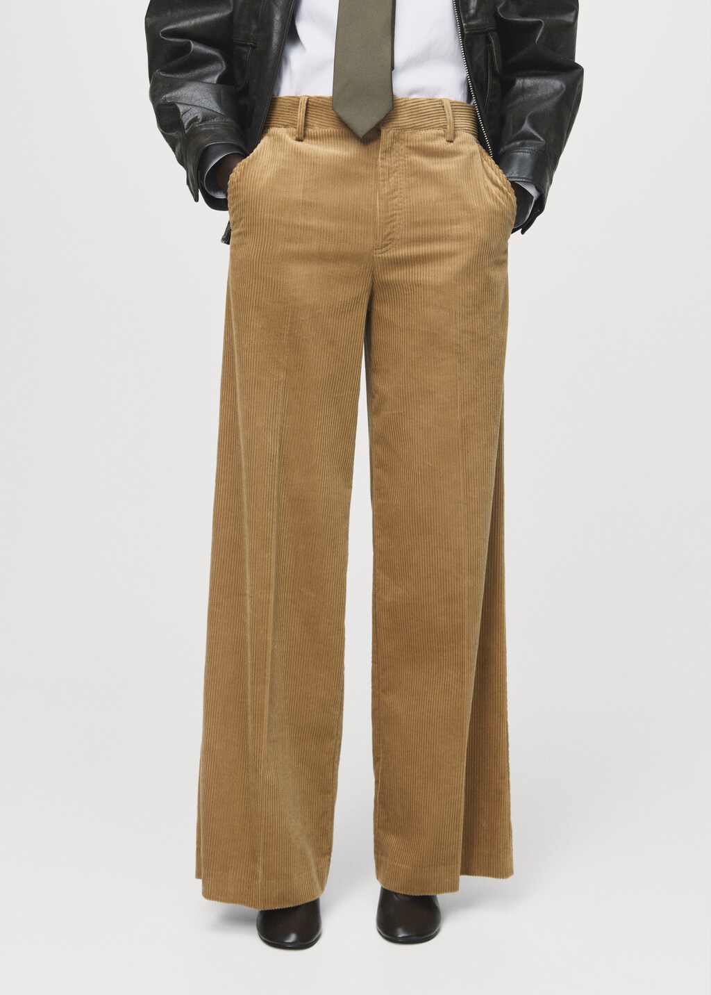 Tissu en velours côtelé. Design long. Coupe large. Taille basse. Passants de ceinture. Deux poches latérales. Deux poches passepoilées à l'arrière. Fermeture Éclair avec agrafe et bouton dissimulés. Doublure intérieure 100% coton.