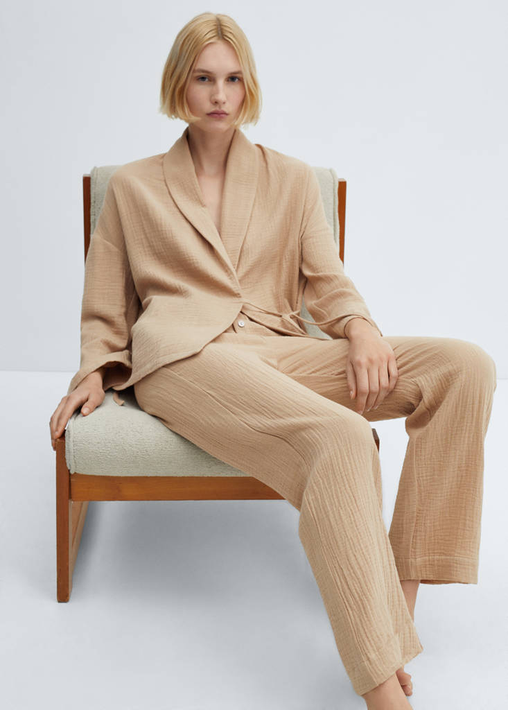 Tissu en mousseline. Tissu fluide. Design long. Coupe droite. Taille élastiquée. Boutons décoratifs. Total look. Tissu 100 % coton