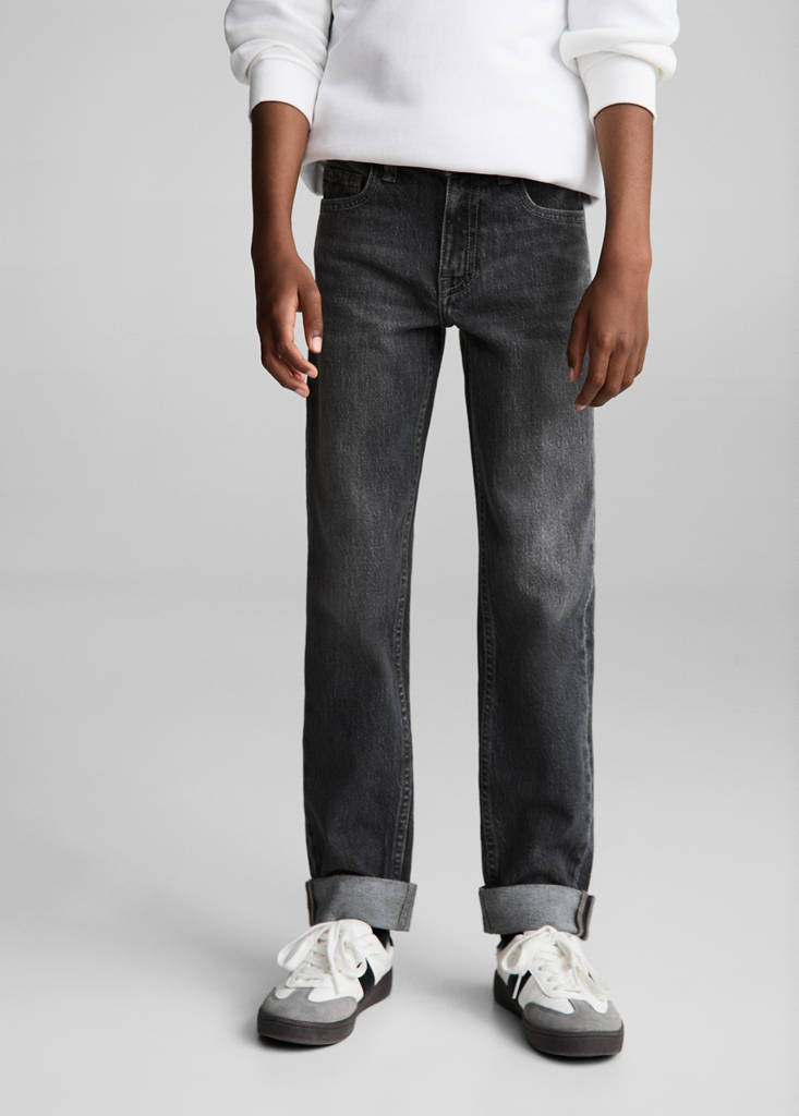 Collection Rentrée des classes. Tissu en coton de style jean. Coupe droite. Design long. Taille mi-haute. Cinq poches. Revers. Fermeture éclair et bouton