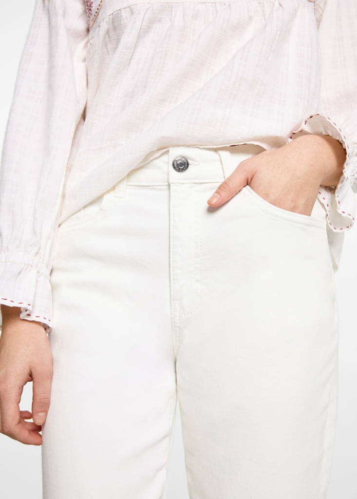 Tissu en coton de style jean. Design long. Coupe droite. Coupe regular. Taille mi-haute. Cinq poches. Passants de ceinture. Fermeture éclair et bouton