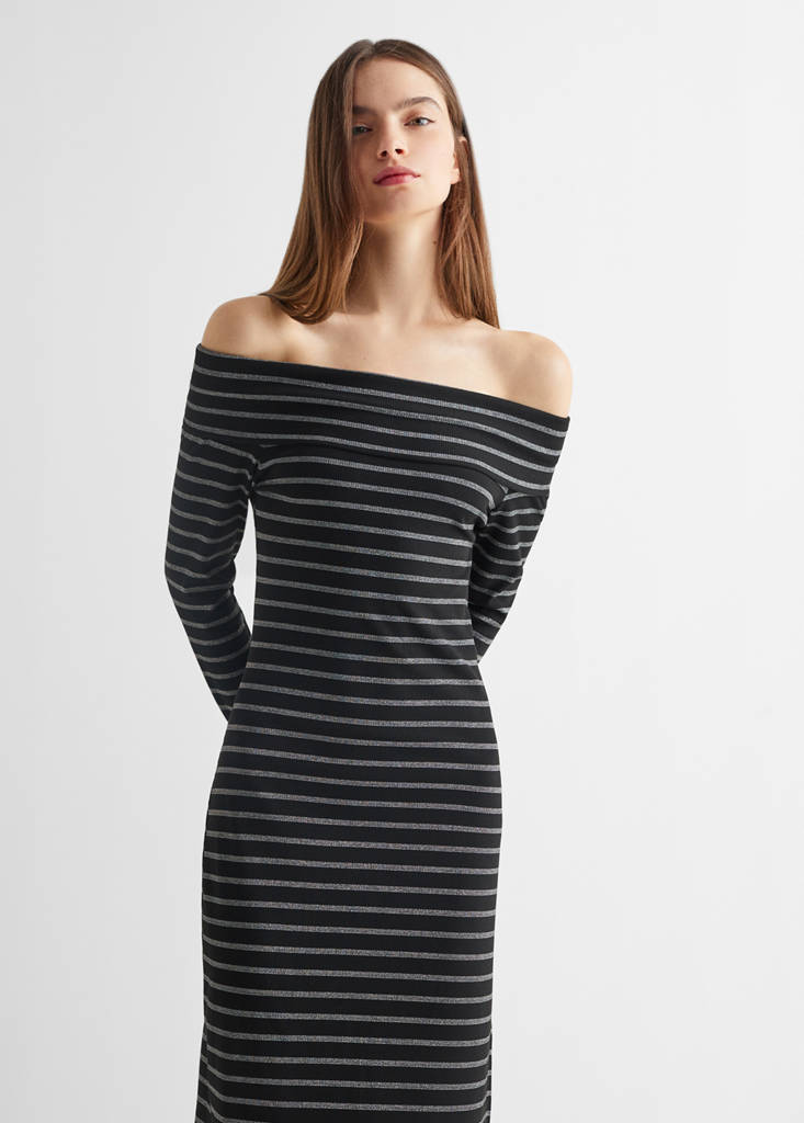Collection fêtes, cérémonie et communion. Design épaules dénudées. Motif à rayures. Épaules découvertes. Détail brillant. Coupe droite. Coupe midi. Fente latérale. Manche longue. Sans fermeture
