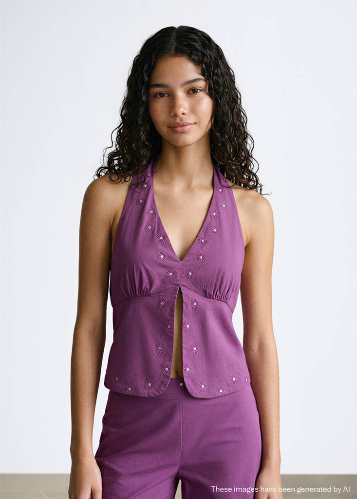 Tissu 100 % coton. Coupe droite. Col halter. Encolure en V. Dos nu. Broderie soleil. Ouverture à l'ourlet. Lien à nouer autour du cou. Boutons décoratifs. Total look