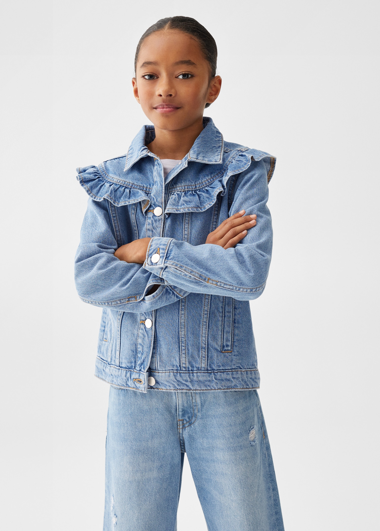 Denim style cotton fabric. Straight design. Two side pockets. Shirt-style collar. Long sleeve. Ruffle details. Button up. This garment is also available in Baby Girl´s collection..